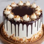 - Finish with Ganache Drip: Warm the chocolate ganache slightly with heavy whipping cream to achieve a dripping consistency. Drizzle over the top edges of the cake allowing it to drip down the sides. Optionally, garnish with additional toasted coconut and almonds.