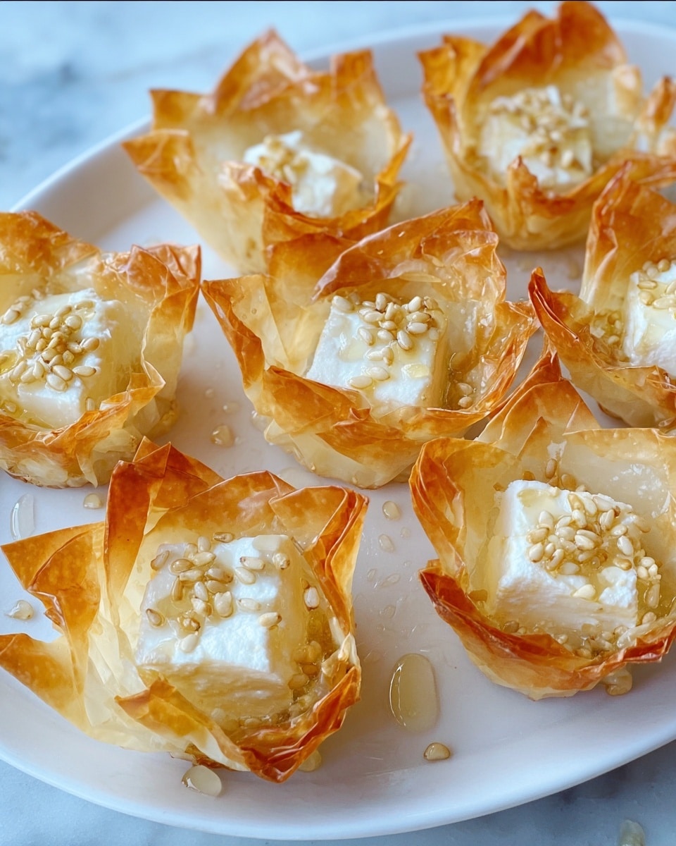 Baked Feta Honey Bites are a delicious and easy phyllo appetizer featuring crispy layered phyllo dough cups filled with savory feta cheese, drizzled with sweet honey, and topped with toasted sesame seeds. Perfect for entertaining or as a simple snack, these bite-sized treats combine flaky texture with a perfect balance of salty and sweet flavors.