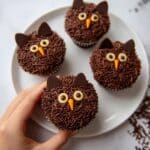 4. Add sprinkles: Roll or sprinkle the cupcakes generously with chocolate jimmy sprinkles, covering the frosting and creating a textured fur-like appearance.