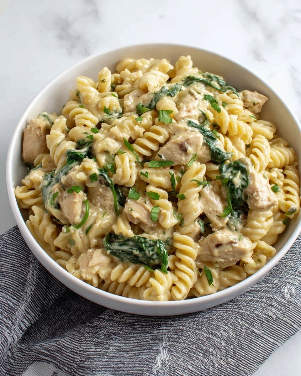 A white bowl filled with creamy pasta made of spiral rotini in a pale yellow sauce. Mixed in are chunks of light brown cooked chicken and vibrant green spinach leaves, scattered evenly throughout the dish. Small pieces of green herbs are sprinkled on top for added color. The bowl sits on a white marbled surface beside a gray and white striped cloth. Photo taken with an iphone --ar 4:5 --v 7