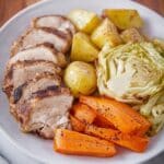 Once the turkey reaches the right internal temperature and your vegetables have started to brown nicely, pull everything out of the oven. I always discard the skin—it’s crispy and helps the flavor but can be a little too rich to eat. Slice the turkey, serve with the roasted cabbage, carrots, and potatoes, and get ready for compliments because this meal is just that good!