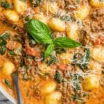 This creamy one pan gnocchi with sausage and zucchini is a comforting, easy-to-make dinner bursting with fresh flavors. Italian sausage is browned and cooked with onions and garlic, then combined with tender zucchini, diced tomatoes, and soft gnocchi. The dish is finished with baby spinach, fresh basil, heavy cream, and Parmesan cheese for a rich, satisfying meal that requires minimal cleanup.