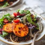 A vibrant and hearty vegan salad featuring tender Du Puy lentils, roasted sweet potatoes, and sautéed fennel with red onions. This flavorful dish is complemented by a zesty lime-honey dressing and fresh greens, making it perfect as a wholesome appetizer or satisfying main course.