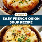 This Easy French Onion Soup recipe features perfectly caramelized onions simmered in beef stock with garlic, thyme, and tomato paste. It’s topped with crispy homemade croutons and a generous blend of melted mozzarella and Swiss cheese. A comforting and flavorful classic that’s simple to prepare and perfect for using up a surplus of onions.