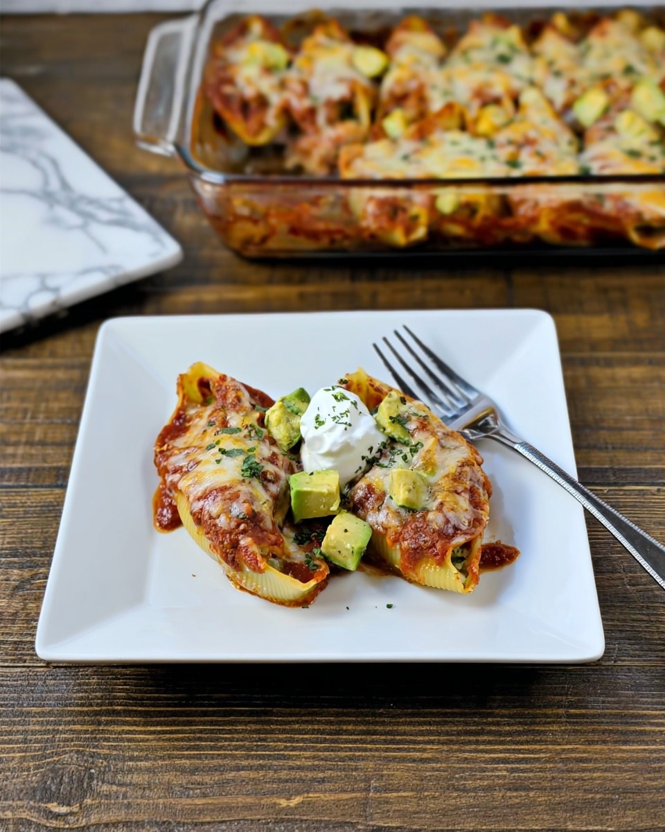 Enchilada Stuffed Shells combine the rich, savory flavors of classic enchiladas with tender jumbo pasta shells for a delightful and hearty meal. Ground meat, black beans, and cream cheese make a creamy, flavorful filling, smothered in enchilada sauce and melted cheese, baked to bubbly perfection. Topped with avocado, cilantro, green onions, and sour cream, this dish offers a fun, family-friendly twist on traditional Mexican cuisine.