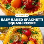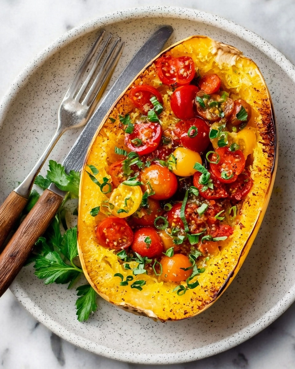 Once baked, carefully flip the squash halves over and use a fork to rake through the flesh, creating those signature spaghetti-like strands. Then, spoon marinara sauce generously on top. Add halved grape tomatoes, sprinkle chopped chives or fresh herbs for a fresh finish, and season with salt and pepper to your liking. Serve it hot and enjoy the magic of something so simple feeling so indulgent!