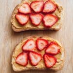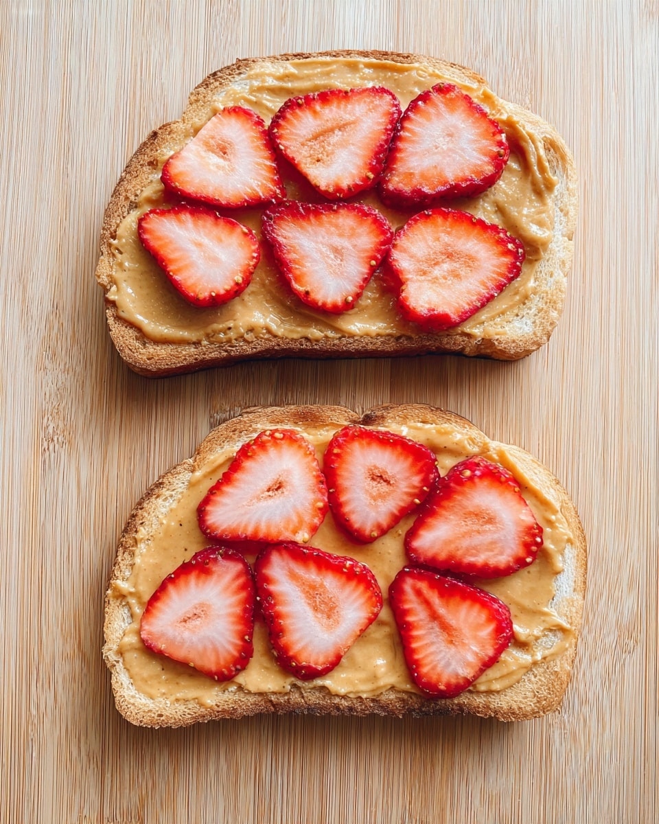 - Assemble Toast: Spoon the custard mixture evenly over each slice of bread, ensuring it covers the surface well. Then, top each slice with sliced strawberries, distributing them evenly.