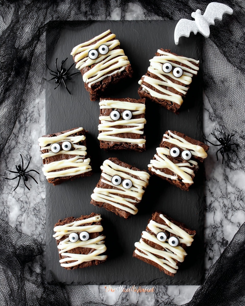 - Mini mummy brownies: If you want bite-sized treats, cut brownies into smaller squares and use mini candy eyes—they’re perfect for party trays!