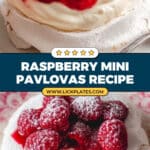 - Assemble the Mini Pavlovas: Once cooled, spoon or pipe the whipped cream onto the center of each meringue nest. Top with the macerated raspberries and garnish with fresh raspberries. Dust lightly with icing sugar before serving.
