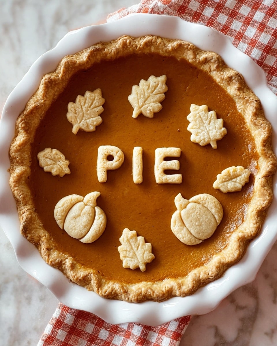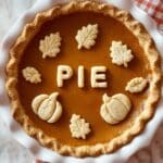 A round pie with a smooth, deep orange filling sits in a white fluted pie dish. The edges of the crust are crimped and golden brown. On top of the pie filling, there are small decorative pieces of crust shaped like leaves and pumpkins, arranged in a circle near the edge and in the center. The word