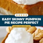 For a full festive meal, I enjoy pairing this skinny pumpkin pie with a hot cup of spiced apple cider or chai tea to really bring out those autumn flavors. If it’s dessert after dinner, a scoop of vanilla bean ice cream on the side always gets rave reviews from my family.