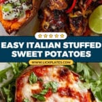 For a festive touch, especially when entertaining, I’ve served these stuffed sweet potatoes in small individual cast iron skillets. It looks rustic and elegant, plus it keeps the potatoes warm at the table. You could also turn this into a fun buffet-style spread with different toppings so guests can customize their own Italian-style sweet potato.