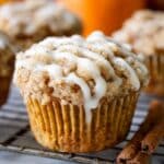 These pumpkin muffins are soft, fluffy, and moist, packed with warm Fall flavors from pumpkin spice and cinnamon. They are topped with a crumbly, buttery streusel and a simple glaze that adds a perfect sweet finish. Ideal for autumn breakfasts, snacks, or a cozy treat.