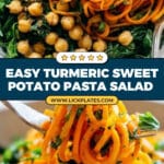 A vibrant and healthy Turmeric Sweet Potato Pasta Salad featuring sautéed spiralized sweet potatoes tossed with turmeric, fresh spinach, chickpeas, and crunchy pistachios for a flavorful and nutritious meal or side dish.