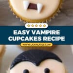 Delightfully spooky Vampire Cupcakes featuring chocolate cupcakes topped with swirls of black frosting, decorated with whimsical vampire faces made from White Reese’s Cups and candy melts. Perfect for Halloween or any fun occasion, these cupcakes combine rich chocolate flavors with creative, edible vampire decorations.