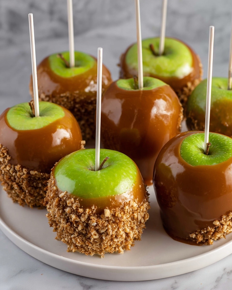 Start by washing your Granny Smith apples really well with hot water—this removes the natural wax coating that would otherwise stop the caramel from sticking. I like to dry them thoroughly with a clean towel to avoid watery drips later. Then, line a baking sheet with parchment paper and stick a popsicle or cake pop stick into each apple’s core. Pop them in the fridge to chill while you make your caramel; this helps the caramel set faster once dipped.